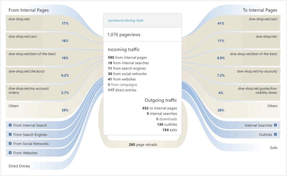 Matomo’s unique Transitions feature lets you easily visualise patterns of behaviour when it comes to entry onto a page and where they exit to.