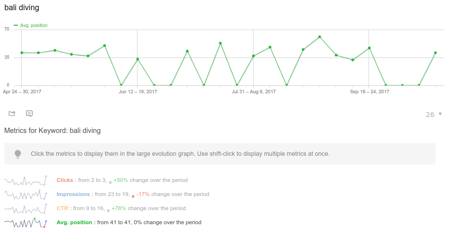 The Search Engine Keywords Performance feature allows you to monitor search rankings for a given keyword and see his evolution: