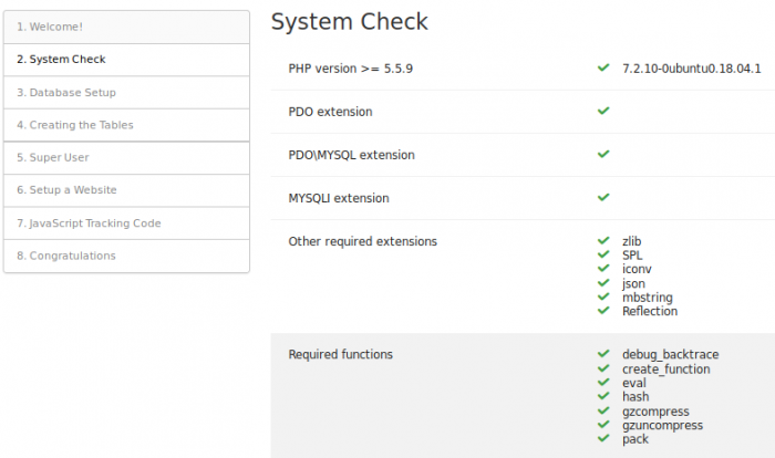 Matomo will check to make sure that your server meets the Matomo requirements. If everything is okay, you’ll see a long list like this: