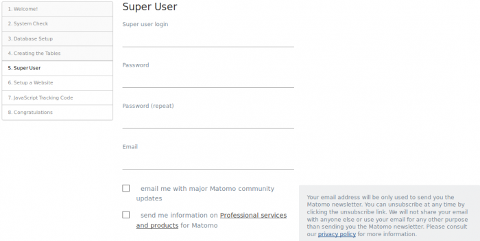 The super user is the user that you create when you install Matomo. This user has the highest permissions. Choose your username and password: