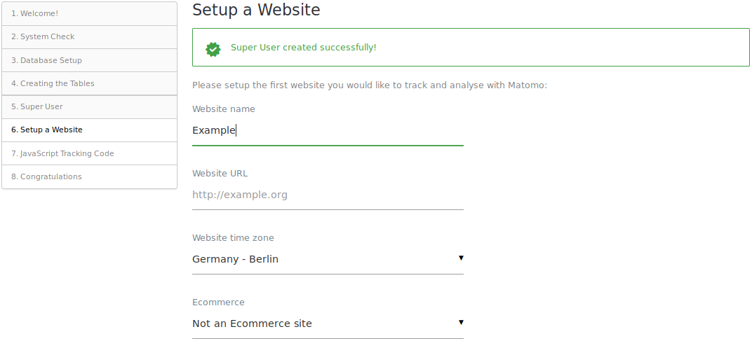 Do not lose this information; it is the only way for you to log in to Matomo for the first time. There is only one super user in each Matomo installation. The super user can perform administrative tasks such as adding new websites to monitor, adding users, changing user permissions, and enabling and disabling plugins.