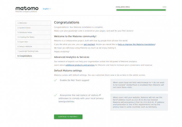 Click Continue to Matomo » and log in to your dashboard!