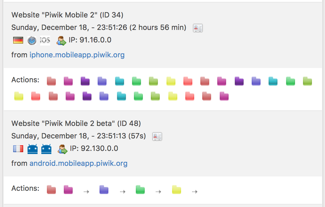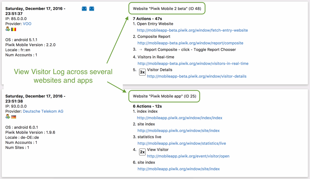 In the Visits Log and Real-time widget you will see all visitors across several websites. To still know which website a visit belongs to, the name of the website is shown above the visit details.