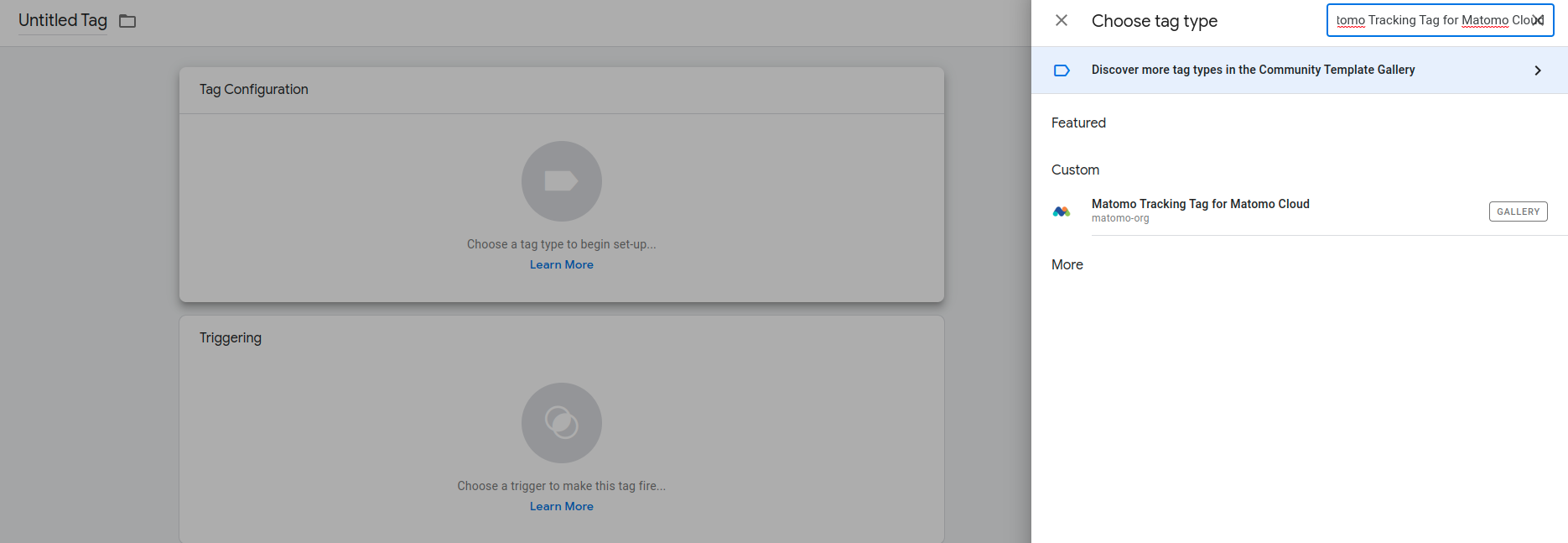 - In the search bar, search for “Matomo Tracking Tag for Matomo Cloud” and select the tag.
