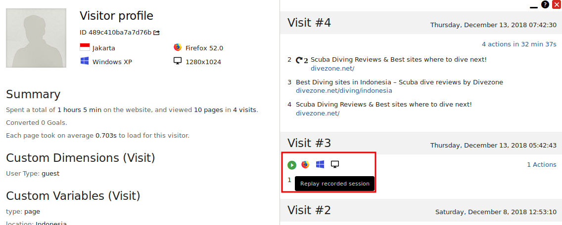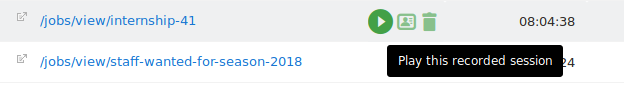 When you browse your Visits Log, a link “Replay recorded session” will appear at the top of each visit which was recorded. Clicking on the link will open and play the visitor’s session video in a new window.