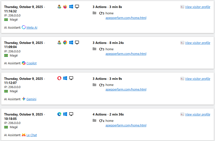 Navigate to Matomo > Visitors > Visits Log to see a real-time list of tracked visits. If a session originates from an AI Assistant, the referrer is clearly labelled.