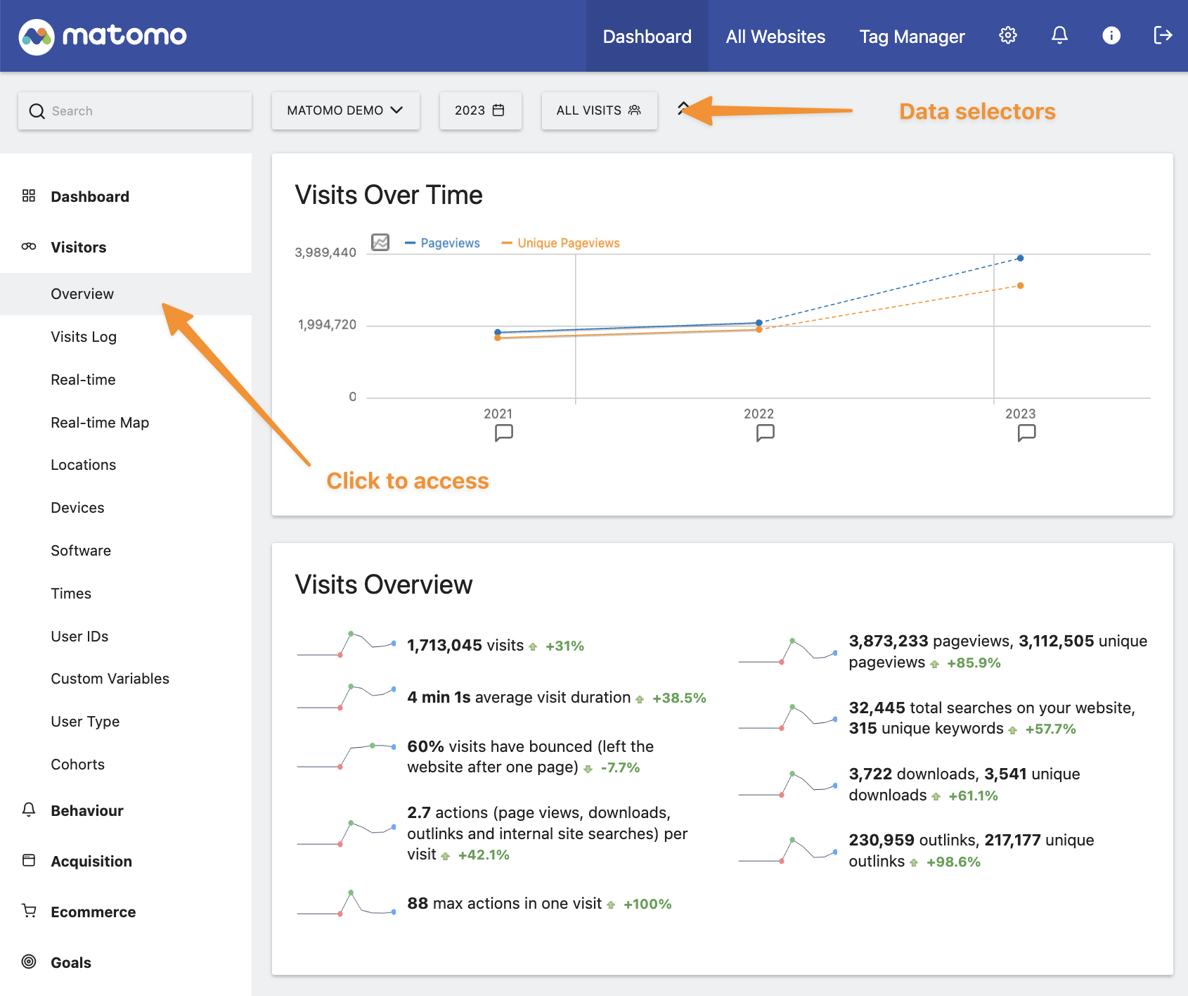The Visitors Overview page provides a high-level summary of your website’s visitor numbers and engagement. You can access this page within the Matomo dashboard by clicking the Visitors menu item in the main navigation and then clicking on Overview.