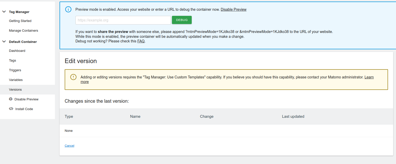 Below is the edit view of a version for users without tagmanager_use_custom_templates capability.