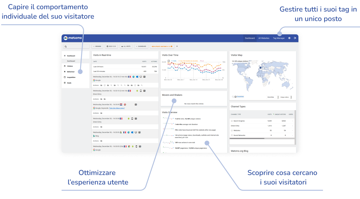Noi di Matomo crediamo che l’analisi dei dati fatta in modo socialmente responsabile sia un diritto di tutti. Come azienda leader nella gestione dei dati che mette l’etica al centro, ti offriamo informazioni più complete, aiutandoti a mantenere la piena proprietà dei tuoi dati. La nostra piattaforma, progettata per rispettare i più rigorosi standard sulla privacy, è facile da usare, conforme al GDPR, e ti permette di importare lo storico dei dati con un solo clic.